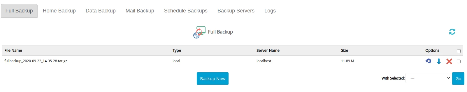 - In the tabs below we can select Full backup, Home backup, Data backup, Mail backup, Schedule Backups, Backup Servers, and logs.