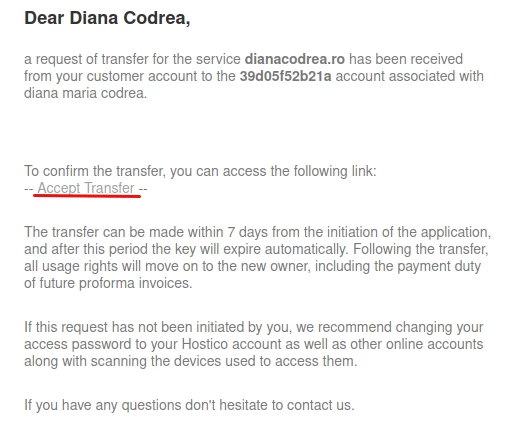 The beneficiary will receive an email at the Hostico customer account address requesting Acceptance of the transfer.